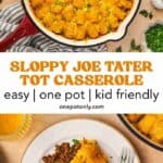 This one pan sloppy joe tater tot casserole comes together in a few simple steps! Flavorful sloppy joe topped with crispy tater tots and melty cheddar cheese, the whole family will love this easy weeknight meal!